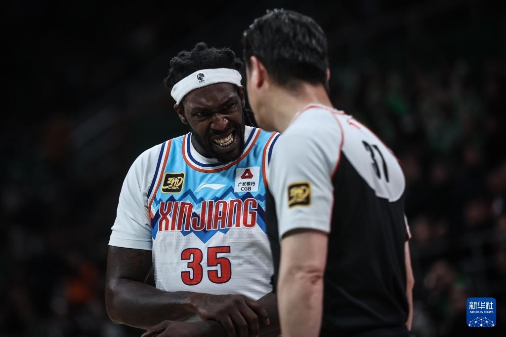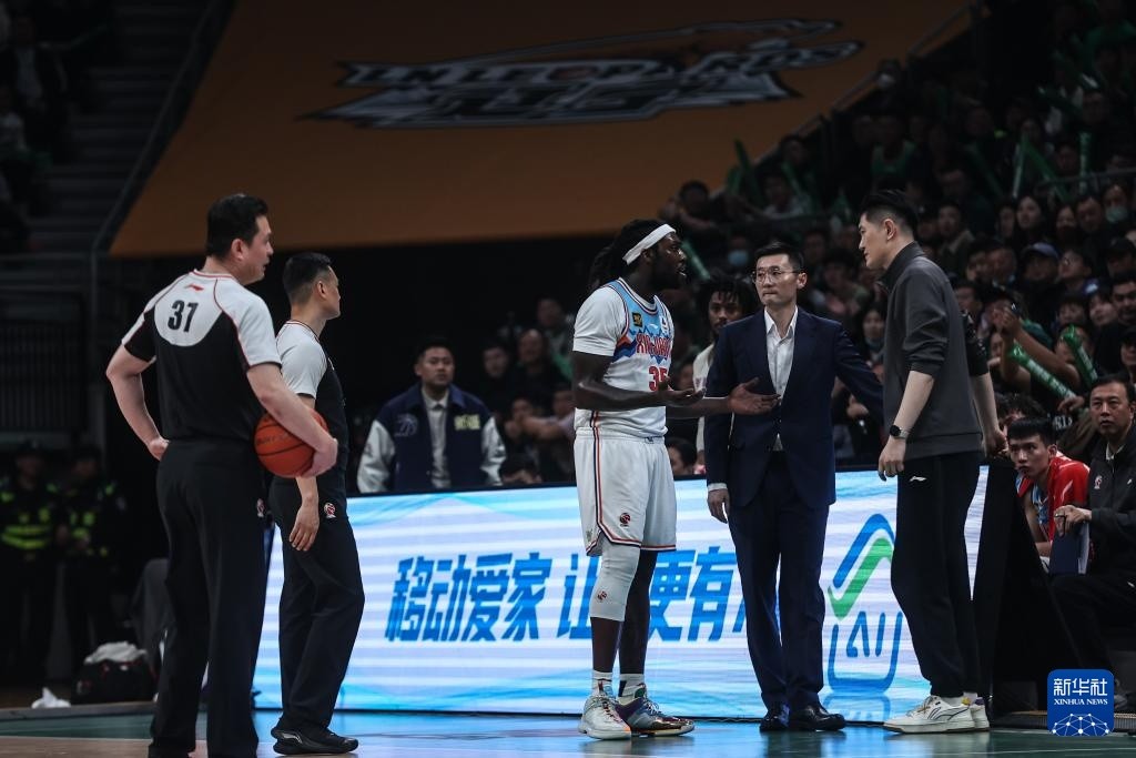 4月13日,新疆伊力特队球员哈雷尔(左)在比赛中与主裁判交流。