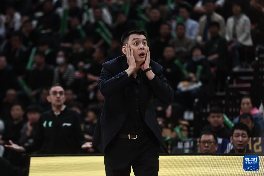 4月13日,新疆伊力特队主教练刘炜(中)在场边指导。