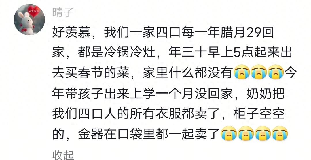 网友1:好羡慕,我们一家四口每一年腊月29回家,都是冷锅冷灶,年三十早上5点起来出去买春节的菜,家里什么都没有而今年带孩子出来上学一个月没回家,奶奶把我们四口人的所有衣服都卖了,柜子空空的,金器在口袋里都一起卖了