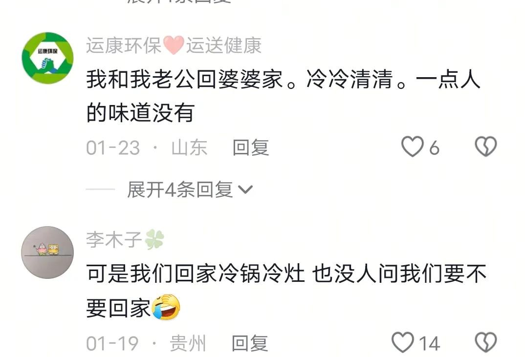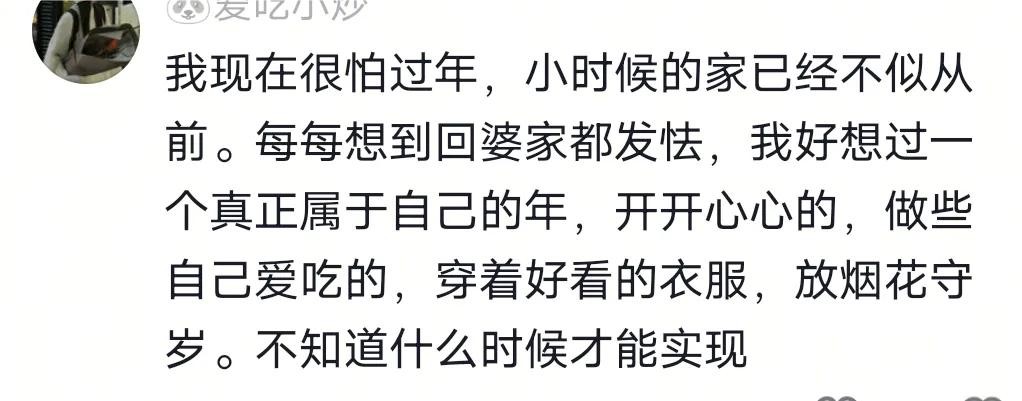 网友4:我现在很怕过年,小时候的家已经不似从前。每每想到回婆家都发怯,我好想过一个真正属于自己的年,开开心心的,做些自己爱吃的,穿着好看的衣服,放烟花守岁。不知道什么时候才能实现