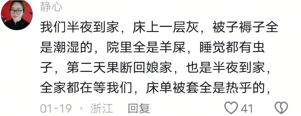 网友3:1400多公里全程我一个人开车,带着老公和闺女回他们家,大中午没给我们娘俩剩一口饭,床铺啥都没有再也不想着回去了。