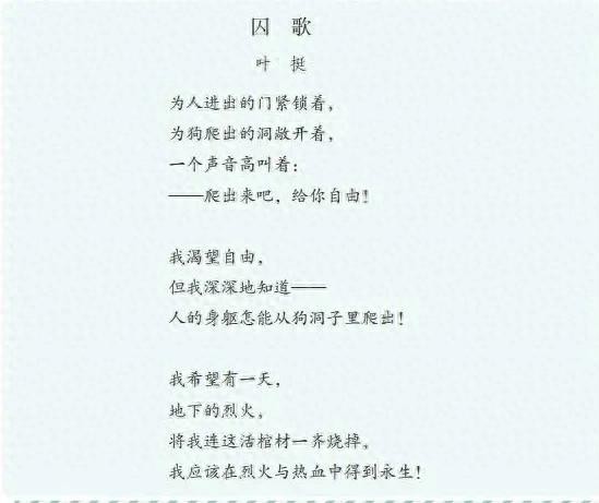 《囚歌》是近代革命者叶挺于一九四二年创作的一首现代诗。此诗揭露了国民党反动派的丑恶行径、极端虚伪的本质,表现了革命者的伟大气节,抒发了为革命献身的壮志豪情。全诗明白晓畅,通俗易懂,如脱口而出,但感情炽烈,气势豪迈,意境表达清晰完整。