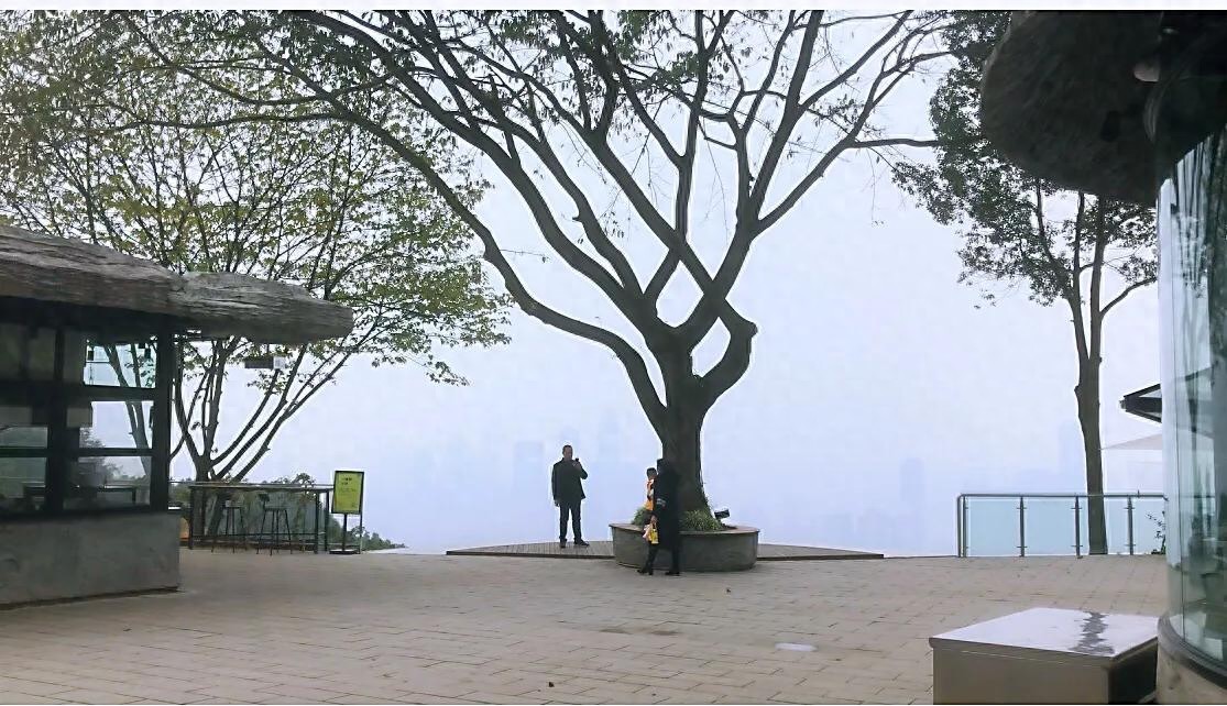 在这颗树边的玻璃平台拍照,可以拍到后面美丽的渝中美景,小西去这天,由于山城雾太大,像是披上了一层面纱,所以只有朦胧的渝中景色。似清非清,似浓非浓,看到这种景象,是不是有种进入仙境的感觉呢?世界上有许许多多璀璨的景色,但这种纯天然的自然景色,才是最令人喜欢的!旁边有一句作家三毛说的话:“如果有来生,要做一棵树,站成永恒,没有悲欢的姿势。一半在土里安详,一半在风里飞扬,一半洒落阴凉,一半沐浴阳光。非常沉默,非常骄傲,从不依靠,从不寻找。”