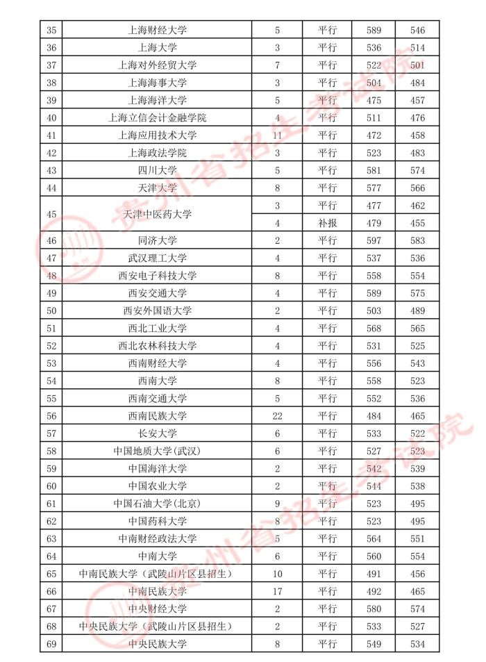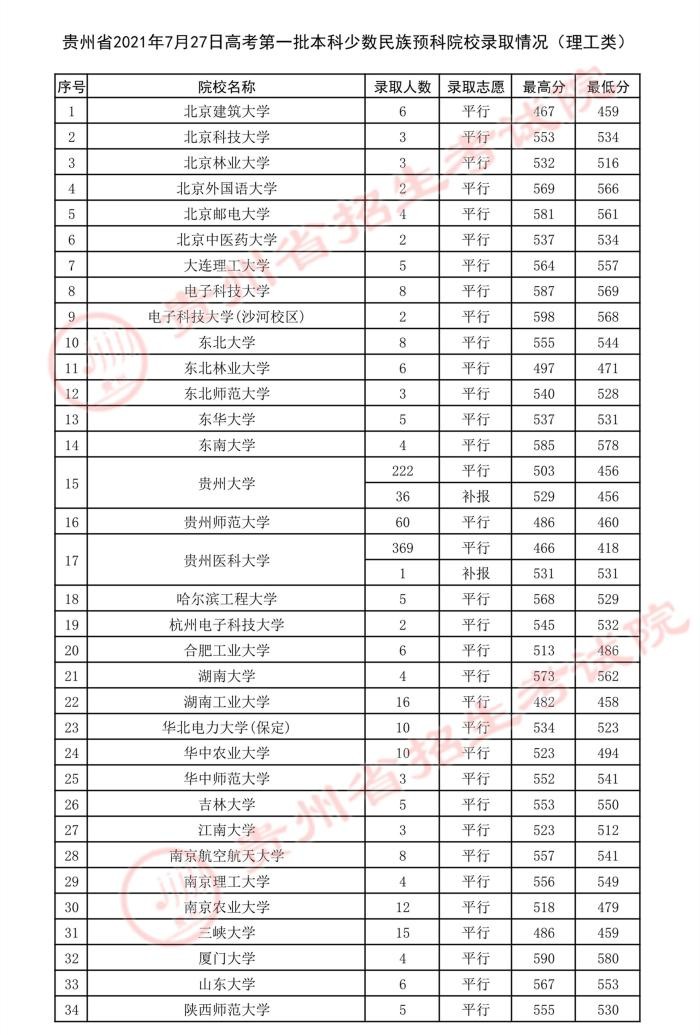 2022高考:2021年贵州省地方专项计划招生院校录取分数线