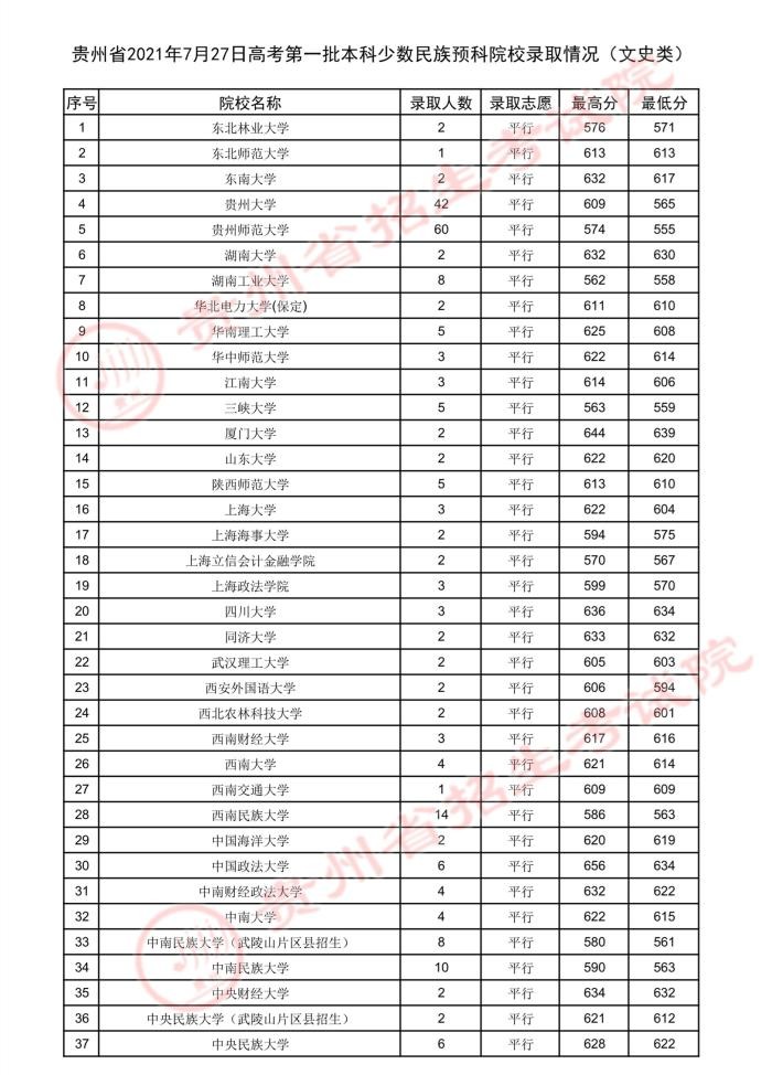 文史类共有37所本科院校在贵州省进行第一批本科少数民族预科招生录取,其中录取分数线最高的为厦门大学,录取最低分为639分。录取分数线最低的为贵州师范大学,录取最低分为555分,比文史类一本分数线低1分。