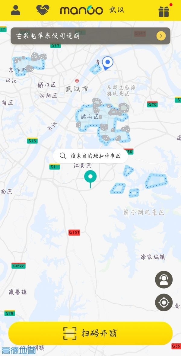 蓝色区域为芒果电单车APP显示的可服务范围。