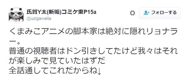 熊巫女动画版结局虽然让不少观众感到十分困惑,不知该做何反应,甚至连编剧都删推特帐户。不过熊巫女的结尾当然不是只有负评,另一派观众其实并不会觉得这样的收尾太糟。像是猎奇漫画家氏贺Y太就在推特上提出了个人看法,表示自己看得很开心。的确以老师的角度来看,隐藏在熊巫女里的黑暗氛围或许很有发挥的潜力吧!