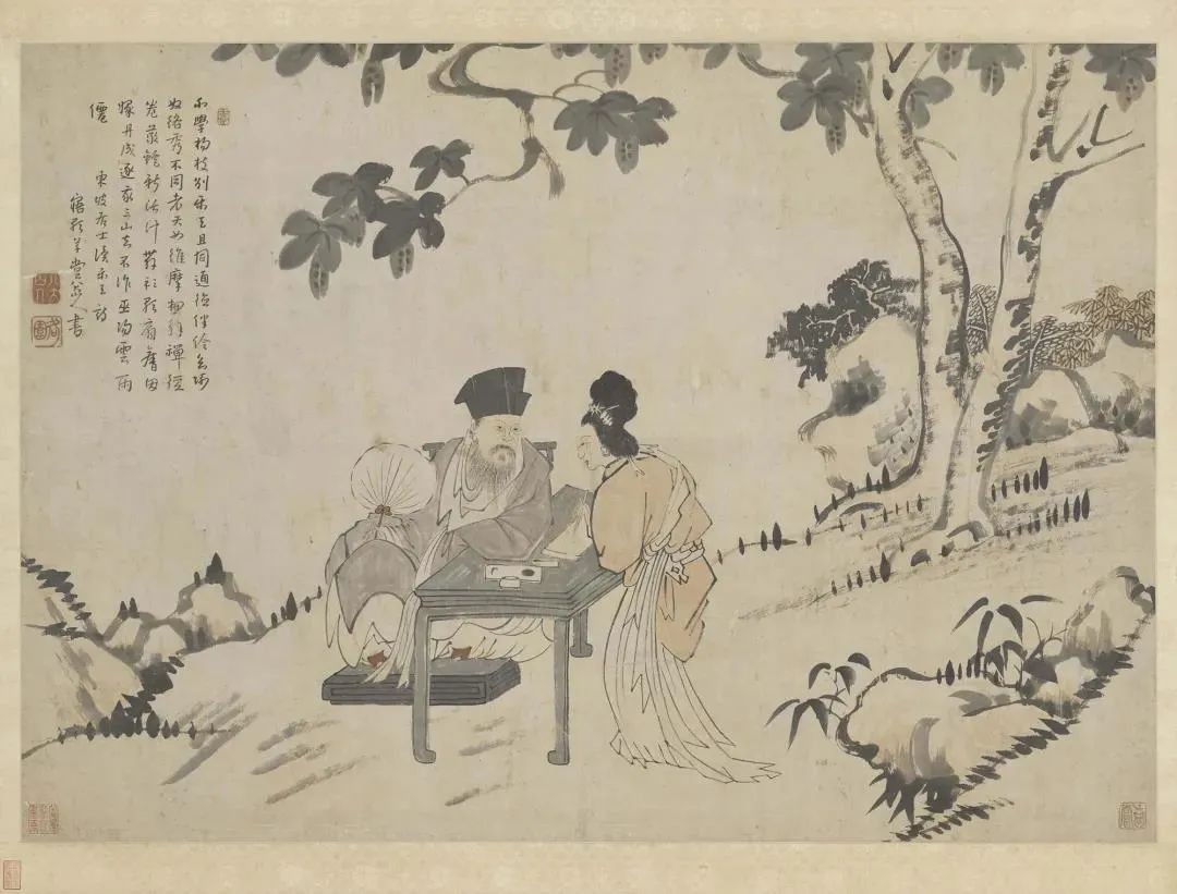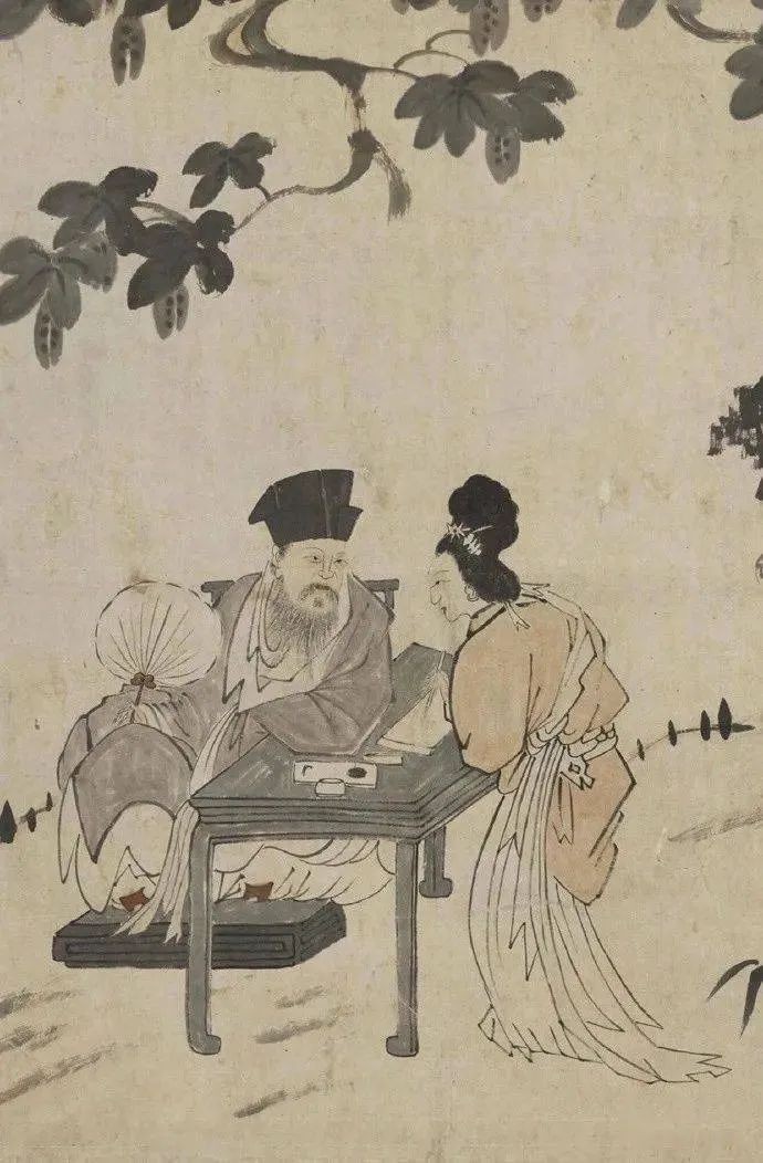 画作中,苏东坡手持葵扇,悠然自得地坐在摇椅上,身体斜靠桌案,双目深情地注视着正在书写的朝云。朝云则身躯微屈,神情专注,仿佛在与苏东坡进行一场无声的对话。背景中的梧桐树和庭园一角,为画面增添了几分宁静与雅致。整幅画作以简练而富有情感的笔墨,生动地展现了苏东坡与朝云之间的深厚情感。