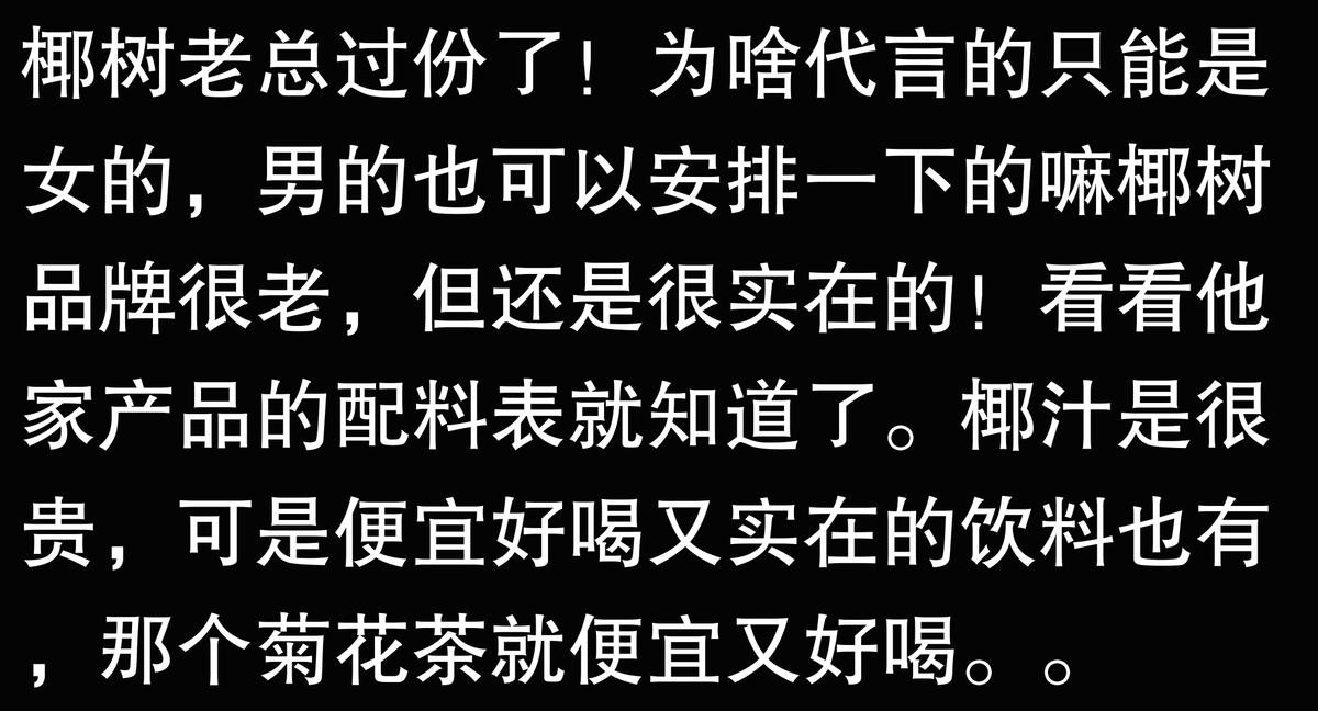 希望椰树也能找健硕青年穿紧身衣摆和冰冰姐一样的姿势做成包装,这样男女两个版看着赏心悦目,直播女的跳完男的跳,彰显活泼健康。