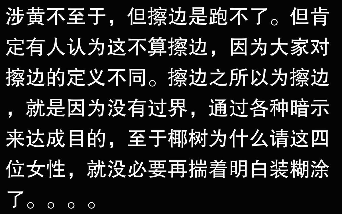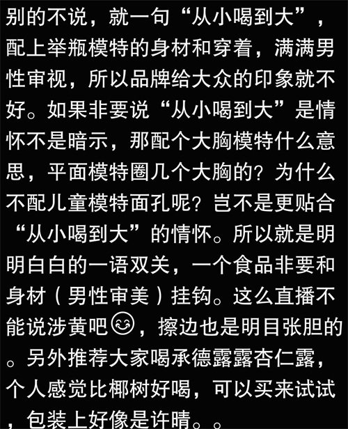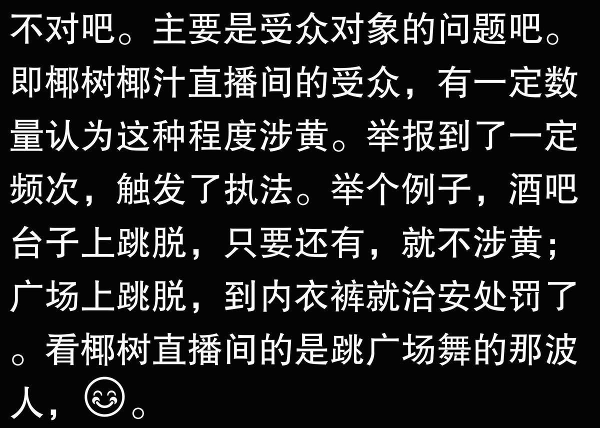 椰树老板和直播间观众都知道自己在看什么,喜欢什么,擦边就是擦边,虽然不至于说违法涉黄,但是装傻就没有意思了,都是男人非得把大美女穿紧身衣大胸说到和幼儿园小朋友跳舞一个性质?