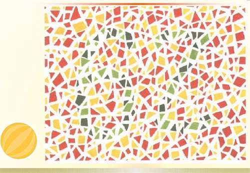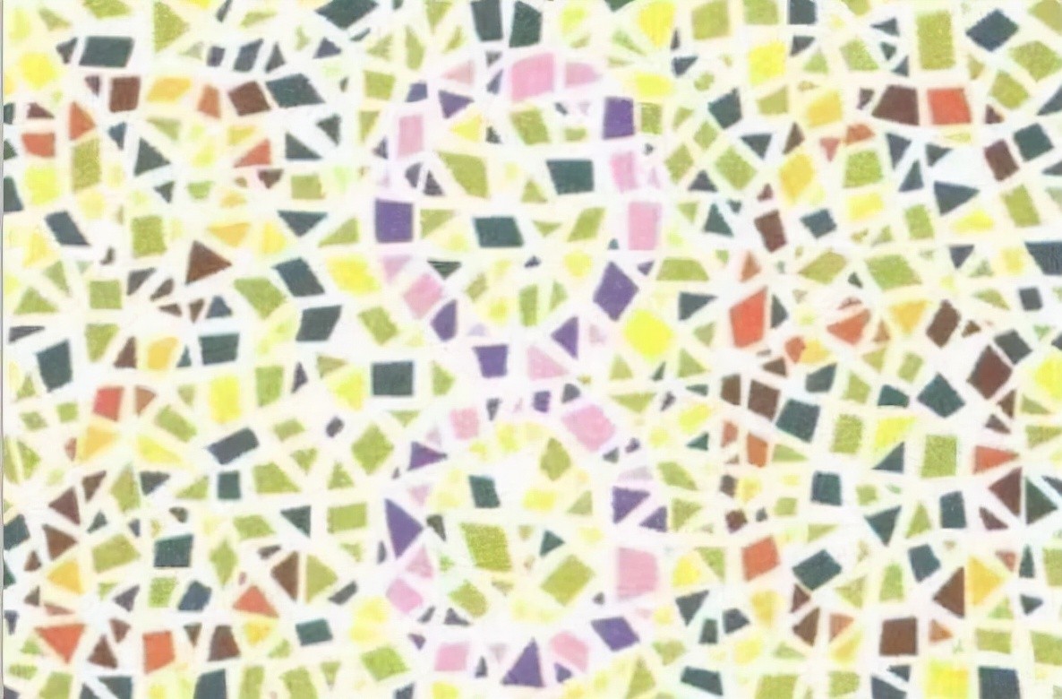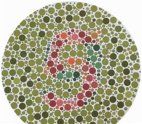 这张图底色是暗绿色,数字的颜色是红色和绿色组成,很多人能看出数字“5”,就认为是一个数字。其实不然,除了红色组成的数字5,还有一个绿色组成的“9”与之重叠,如果是红绿色盲的话,看着两个数字就是同一个颜色,根本分辨不出来。