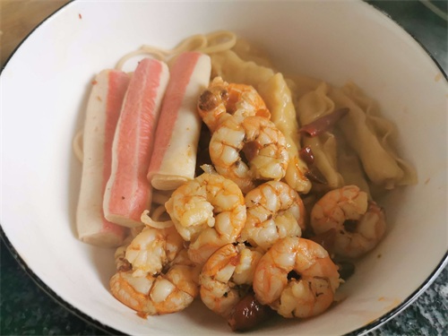 9.放入面条和虾仁煮