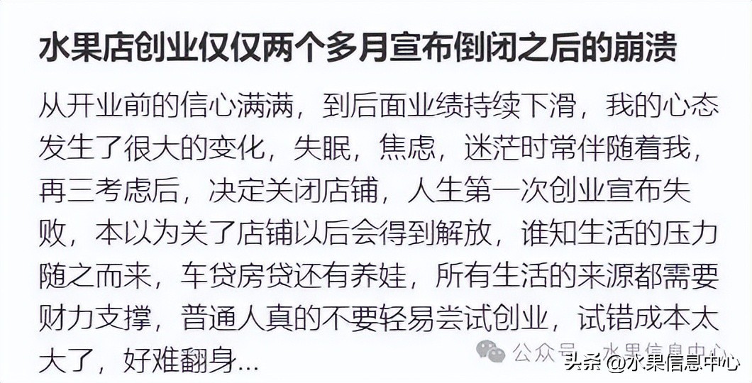 开店的朋友告诉果哥,花了20多万开的店,却即将面临倒闭。最初以为开个水果店非常的简单,没有想到想要盈利真的很难。对于普通人来说,没有足够的资金来支撑,很容易倒下,开店前自己也考察了很久,人流还挺多。后面自己开店了才知道人流不代表客流,加上今年水果进价很贵,历经疫情,大家对消费的需求也降低了。熬完这个月就撤了,每天只有几百的营业额真的会把人搞垮,还是赶紧及时止损吧。