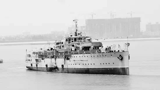 打捞出水并经过修复的“中山”舰在拖轮推动下航行 (图片来源于网络)