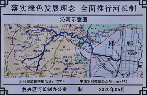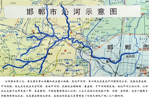 网上查询信息显示,沁河原名牛首水,是邯郸主城区的一条季节性河流,是横贯邯郸市东西的一条重要河流,属滏阳河支流,发源于邯郸西部丘陵区。沁河全长43.8km,有三条支流:北流称为岩嵛河,它自紫山南麓流至葛岩嵛村南偏东,合为沁河而东流;中间为牛叫河,它自武安车辋口村北东流经复兴区停泗头、东高河、大河坡、北牛叫等村,后东折流至牛叫河村东合为沁河;南流自武安胡峪村,经复兴区康庄乡南李庄村南向东北流,贯穿康庄、户村,在牛叫河的村东南合为沁河。三源汇合后东流,经百家村、西关入滏阳河。