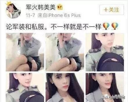 13.一个叫“军火韩美美”的微博用户,标榜自己是“总参高级女军官”,晒出大量浓妆艳抹、举止不雅的军装照片,处处显摆“透露”自己的“巨大背景”,被网友揭穿其假军人身份。