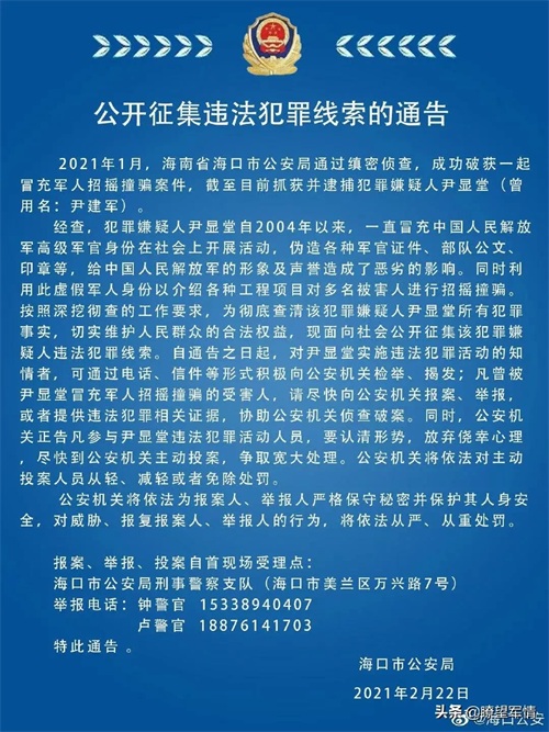 逮捕犯罪嫌疑人尹显堂(曾用名:尹建军),假冒军人行骗17年,现在公开征集此人违法犯罪线索。