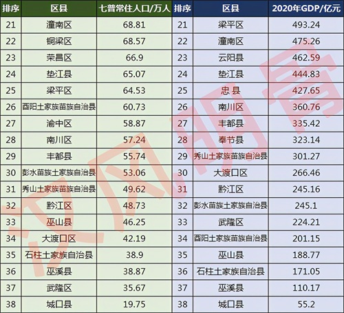 重庆市下辖26个区、8个县、4个自治县共计38个县级行政区,以下为重庆38个区县的人口分布情况: