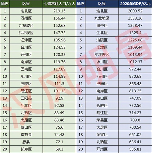 沙坪坝区常住人口为147.73万人,江津区常住人口为135.96万人,合川区常住人口为124.53万人,开州区常住人口为120.33万人。开州区是重庆市26个市辖区中面积最大的市辖区,但开州区2020年GDP仅有535.81亿元,在重庆市26个市辖区中仅排名第20。