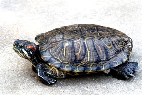 巴西龟红耳龟,也被称为巴西龟、红耳龟、小彩龟,属于水栖龟,很少甚至几乎不会在岸上活动,如上图,其眼睛下侧有一段红色区域,这也是红耳的来源。