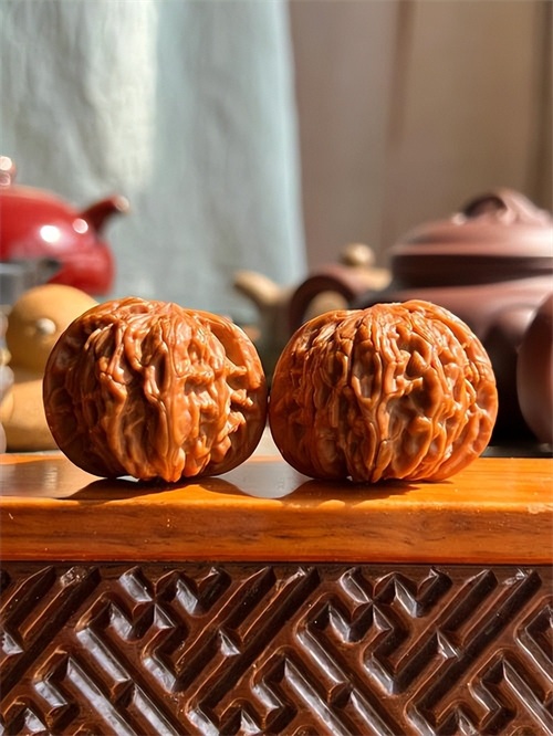 好的文玩核桃应该有足够的重量,手感沉甸甸的。在挑选时,可以拿起核桃轻轻摇晃,感受其重量与平衡感。检查皮色与瑕疵