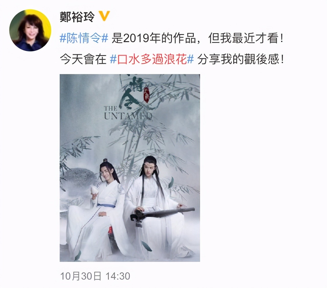 11月3日,一段郑裕玲谈到肖战的音频引起了众多网友的热议。这段音频来自郑裕玲主持的节目《口水多过浪花》,她在其中大谈对《陈情令》中肖战演技的看法。