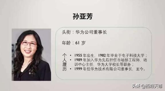 其实在华为,还有一位女性灵魂人物,她就是华为前董事长孙亚芳。据说当时在华为,孙亚芳被尊称为‘华为女皇’,她见证了华为高速扩张的每一步,同时也以自己的能力和威信。