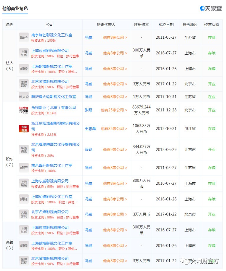 不过,冯绍峰名下的公司并不比赵丽颖少。天眼查数据显示,冯绍峰(本名 冯威)担任5家公司法人,在7家公司担任股东,在3家公司任高管。这其中包含了上海东威影视有限公司、浙江东阳浩瀚影视娱乐有限公司等。