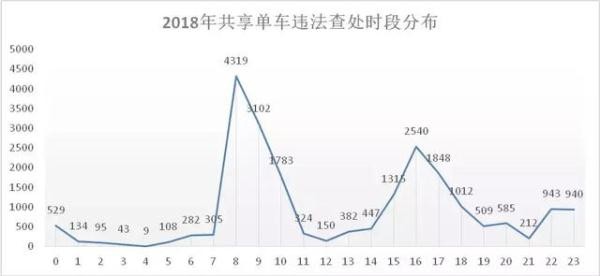 经对共享单车违法查处时段统计,违法时间主要集中在8时-10时和15-17时,其中8时和17时违法情况达到峰值。