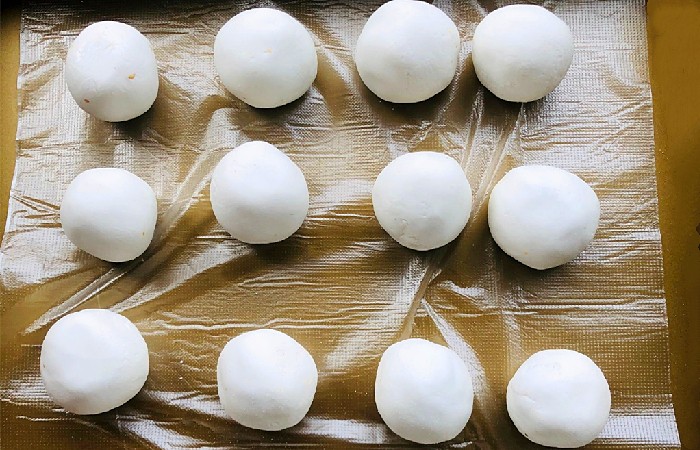 面团揉好以后,就像做饺子皮一样,擀出一个个面片。再把冰箱里的馅儿取出来,一个面片包一个馅儿,在揉圆润了就好了。最后在准备一个盘,倒入少许糯米粉,把包好的汤圆放上去,滚动一下,沾满薄薄一层糯米粉即可,汤圆就这样做好了。