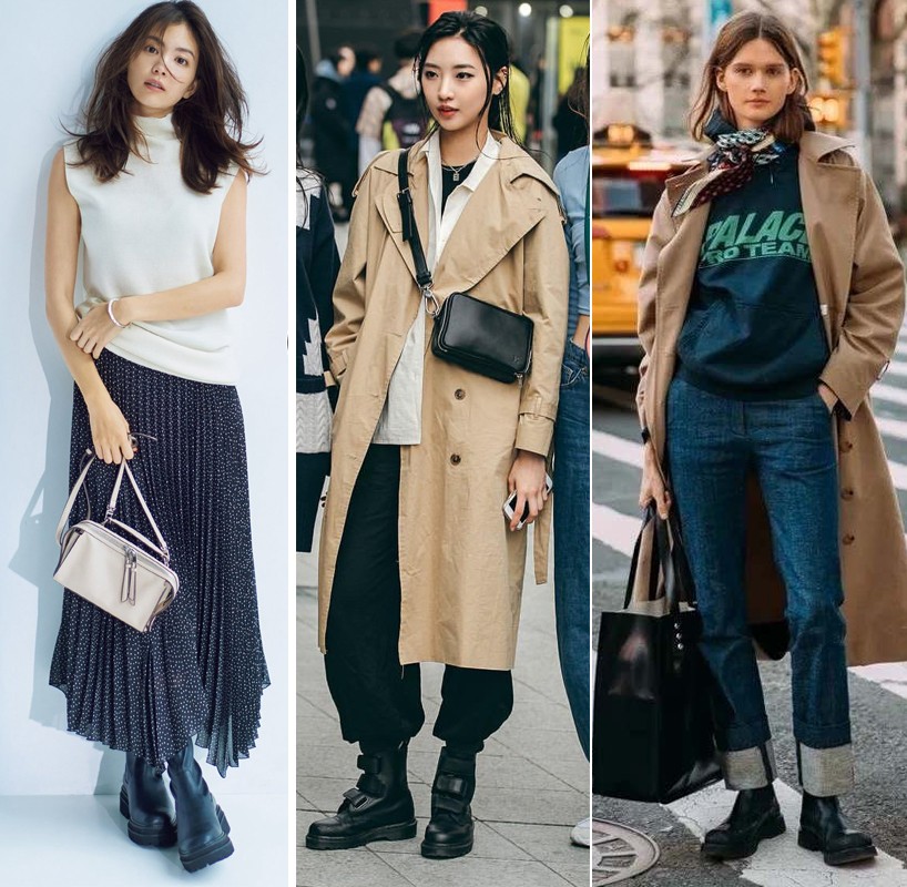 如果想要减龄显年轻,建议大家尝试厚底窄口的短靴,除了可以显高,在外形上也更粗犷有型,还非常洋气。搭配衣服的时候,因为这种鞋款比较有重量感,显得有点笨重,所以最好也选择面料材质比较轻盈的裙子来搭配。搭配裤子的话,最后配束脚裤,如果搭配牛仔裤,卷一下裤脚来带出利落的感觉会更帅气,也可以像下图中间的这位女生这样,把阔腿裤的裤脚塞进鞋帮里面,更显得酷感和帅气,时髦感翻倍,也更有范儿。▼
