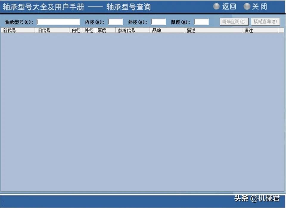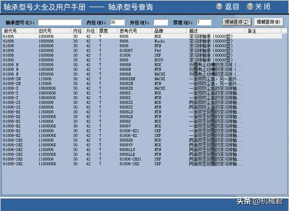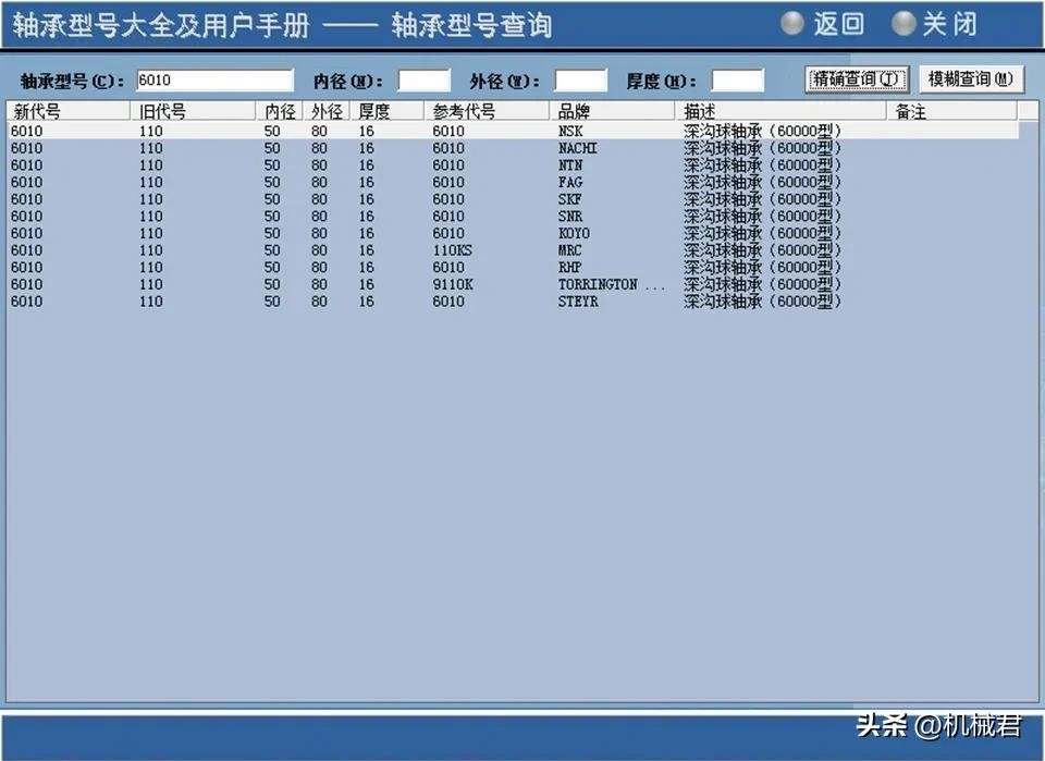 5、轴承型号查询—输入轴承内径和厚度+精确查询