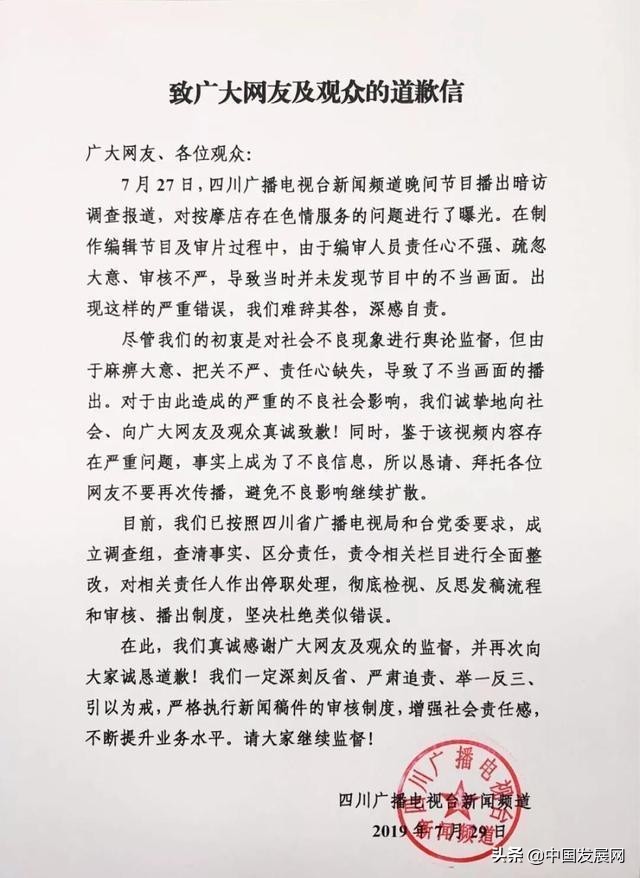道歉信称,7月27日,四川广播电视台新闻频道晚间节目播出暗访调查报道,对按摩店存在色情服务的问题进行了曝光。在制作编辑节目及审片过程中,由于编审人员责任心不强、疏忽 大意、审核不严,导致当时并未发现节目中的不当画面。出现这样的严重错误,频道难辞其咎,深感自责。