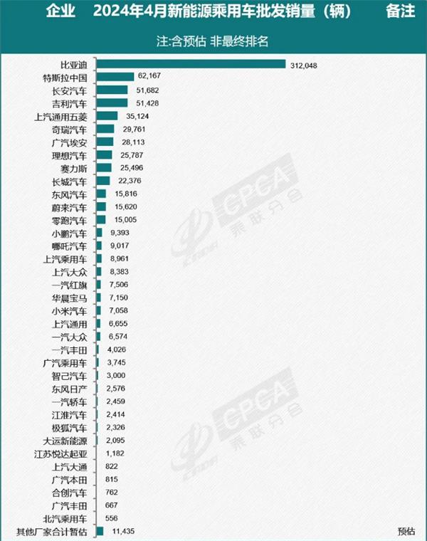 在乘联会的销量榜单中,比亚迪以 312,048 辆的月销量稳居榜首,是特斯拉销量的五倍多。