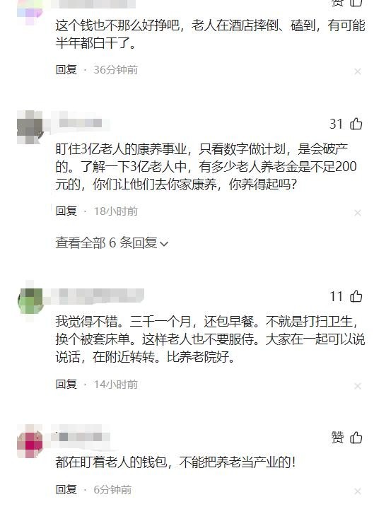 面对“酒店+养老”模式的兴起,网友们的观点分为两派。支持者认为,这种模式能为老年人提供更多选择,尤其是那些既有闲暇时间又有经济实力的银发族。“与其待在家里孤单,不如选择一个风景优美、服务周到的地方养老,何乐而不为?”一位网友留言道。