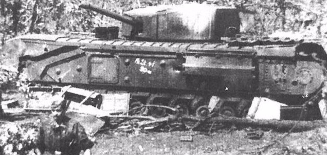 这时距离英军装甲旅先头部队赶到已经不足10分钟的路程了,而那名党卫军中尉还在道路上与那些溃兵纠缠不清,布尔少尉的军衔比他低,并且他还是党卫军警察部队的军官,根本无法制止这名中尉毫无军事头脑,冲动举动。仅仅5分钟后,英军炮火就在溃兵人群中炸开了花,这些溃兵很快吸引住了英军装甲部队的注意,但目标出现时确实让我们感到压力倍增汗流浃背,整整十五辆英军重型丘吉尔坦克出现在了道路前方的森林中,坦克上面满载着英军士兵,很快溃兵向高地逃串准备反击,英军前头部队只有一个步兵连却来了十五辆英军丘吉尔重型坦克,在当时确实让我们感到意外。