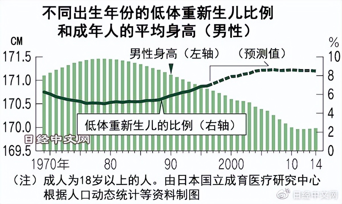 日本国立成育医疗研究中心(位于东京都世田谷区)的社会医学研究部部长森崎菜穗等人对1969年~2014年出生的儿童出生时的状态和成人(18岁以上)身高的变化进行了调查和预测。结果发现,1980年以后出生的成年人的平均身高下降。影响因素似乎是2500克以下的低体重新生儿增加。日本国内外的研究表明,低体重新生儿成年后的身高偏矮。