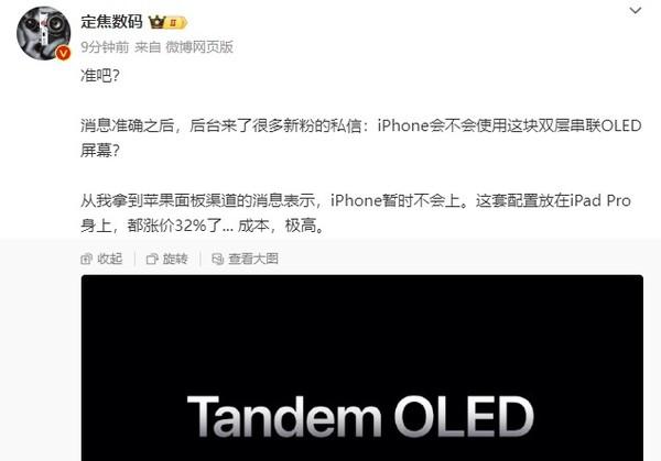 根据数码博主的说法,苹果面板渠道传出的消息显示,iPhone 暂时不会上双层串联 OLED 屏幕。据悉,这套屏幕配置放在 iPad Pro 上带来了 32% 的涨价幅度,成本极高。也就是说,在苹果还没将双层串联 OLED 屏幕的成本打下来之前,新 iPhone 应该不会急于采用这项新技术。此外,这项技术应用在平板和手机上的难度可能也有所不同。