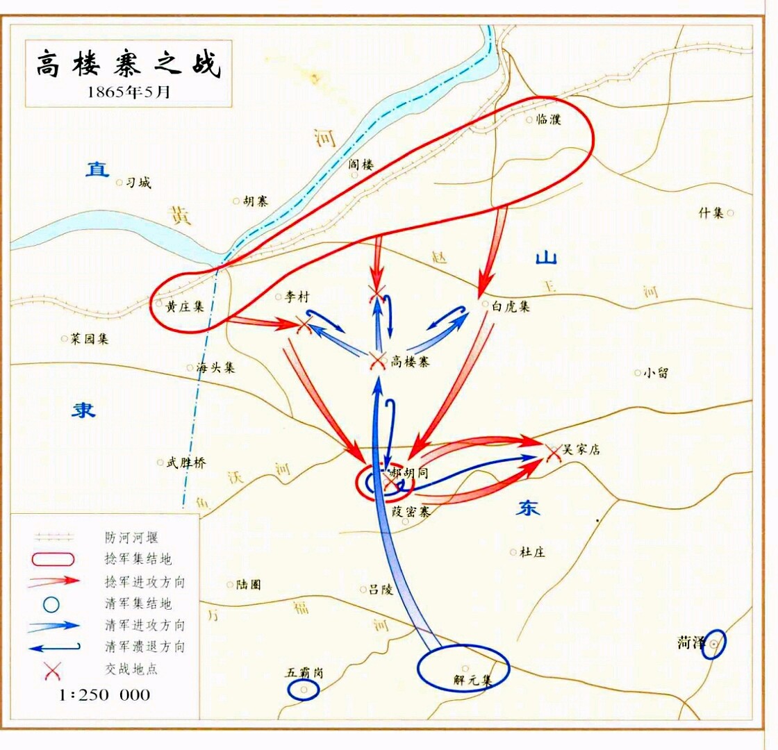 这时的僧格林沁一心求胜,孤军深入,想毕其功于一役,没想到却被张宗禹看出虚实,让僧格林沁陷入万劫不复的境地。1865年5月18日,僧格林沁率领队伍在曹州攻打高楼寨,这个地方易守难攻,水网密布,高地沟壑纵横,不利骑射。在此之前,满清朝廷有意削弱汉军势力,所以当朝廷让湘军北上支援僧格林沁的时候,曾国藩一直阳奉阴违、抗命不前,任由僧格林沁孤军前进。