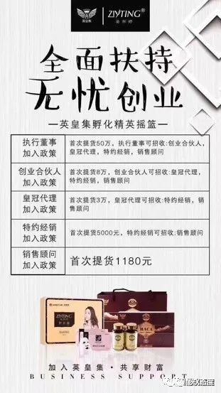 据悉,姿燕婷产品的销售主要采用微商模式,代理制度从高到低分为执行董事、创业合伙人、皇冠代理、特约经销以及销售顾问5个级别。英皇集仁和姿燕婷授权代理加盟政策如下: