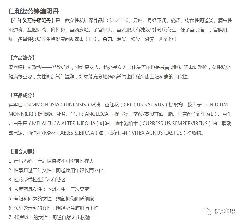 仁和药业姿燕婷缩阴丹,第一成份安全,外胶囊是蜂胶,成份全是提起名贵中药精华。安全到可以口服。10几种名药精华全是针对女性妇科,排毒,排垃圾,杀菌,抑菌,消炎,调理月经宫寒,恢复,恢复弹性,补,护卵巢,助孕。又方便,不用清洗,不用拿出,不用吃药,不用打针。吃十年中药,不如用一年中药效果快,药直接到子宫内调理,效果好过你吃药的疗效一百倍……