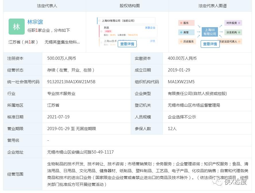 接下来就让我们来了解一下这位”女老板”,以及这是一家什么样的公司.根据企查查显示,无锡英皇集生物科技有限公司成立于2019年,注册资金为500万元。法人代表为林宗谊,也是公司大股东及实际控制人,持股比例为80%,而董事长陈晓燕仅持股20%。
