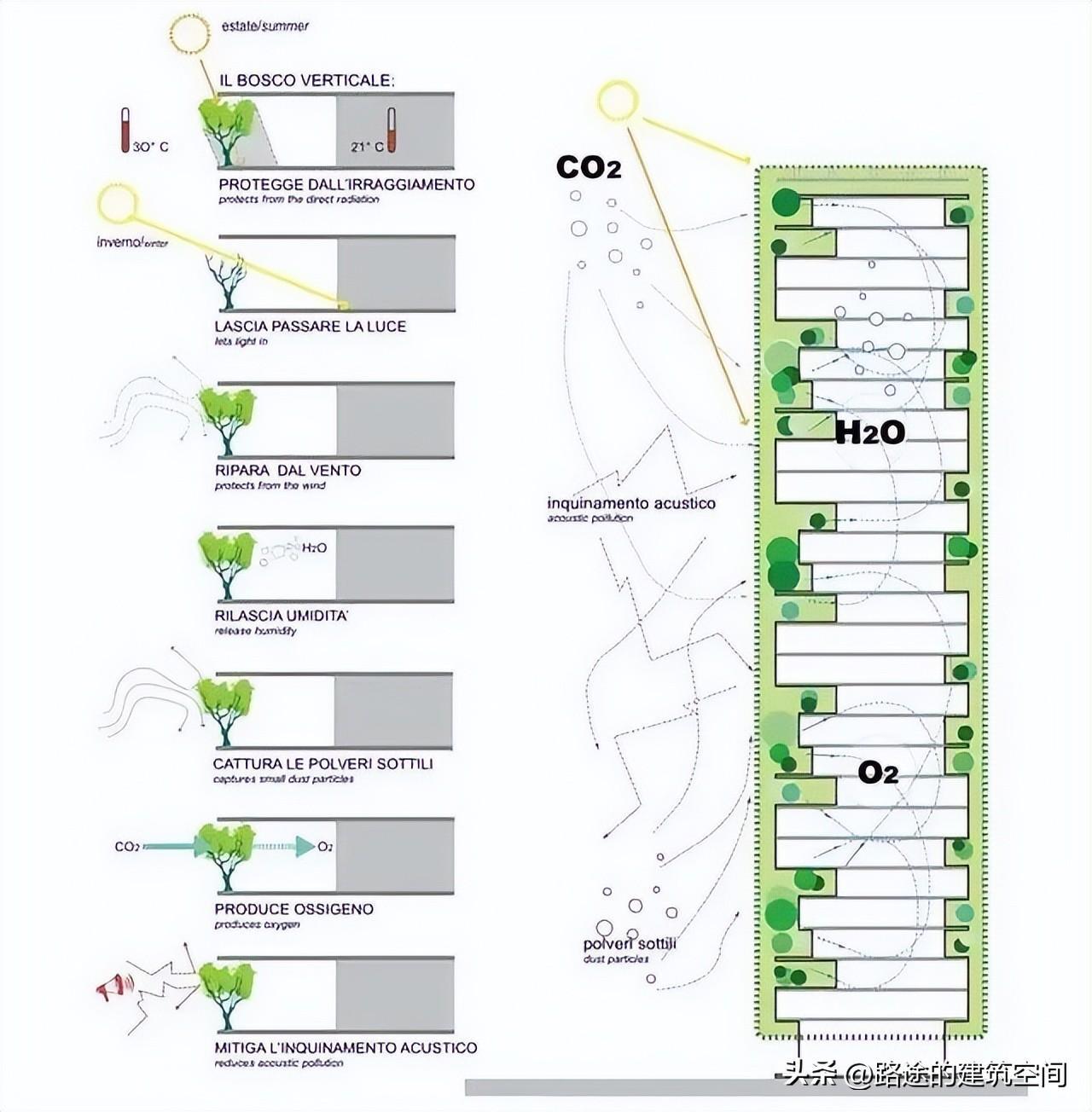 意大利米兰的“垂直森林”是世界上第一座第四代居住高层建筑。分别在高约111.25米和约79.28米的姐妹楼上,会沿着外墙体、层层种下共800棵乔木、5000株灌木和1.1万株草本植物,故两座建筑又被称为“垂直森林”。