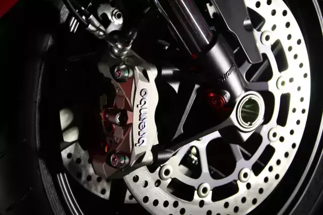 选用 showa 可调倒插前减震,Brembo 刹车刹车泵并配有 ABS。前轮胎型号为120/70倍耐力高性能轮胎。