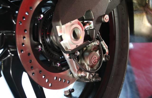 后刹车同样配备 Brembo 刹车泵与 ABS。后胎型号 180/60 倍耐力高性能轮胎。