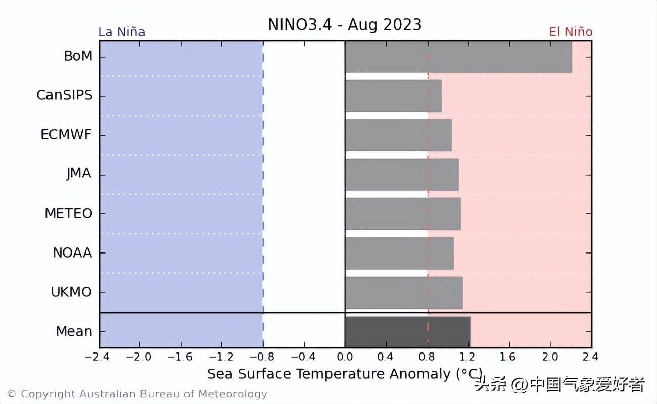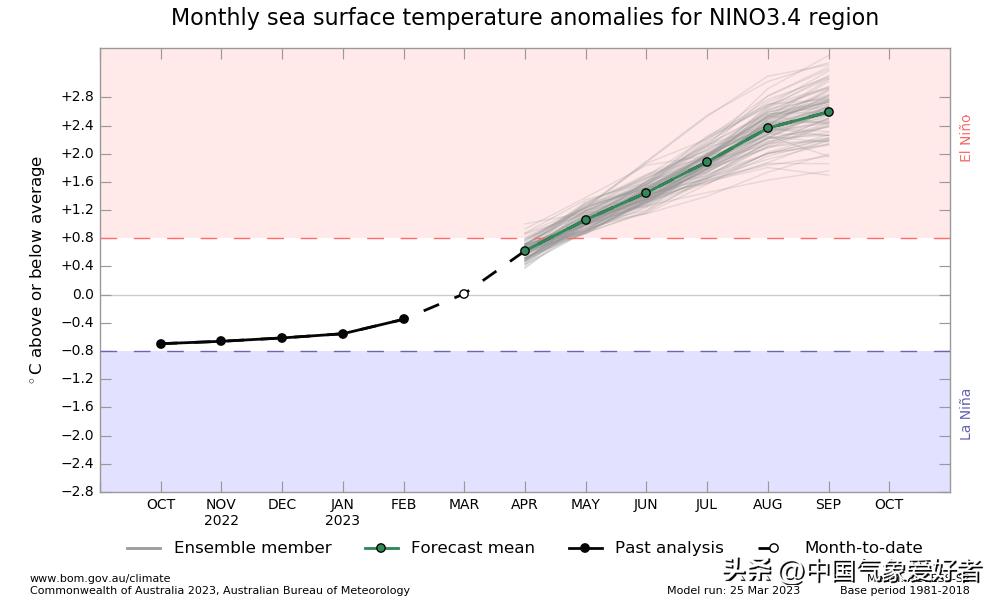 目前,许多计算机气候模型都预测今年晚些时候会过渡到厄尔尼诺现象。比如澳大利亚气象局最新发布的预报显示,Nino3.4水温将在今年夏季“一飞冲天”,甚至可出现2度以上的强正距平,意味着不仅极大可能发生厄尔尼诺现象,还可能出现的是强厄尔尼诺,如果这一预报实现,这将导致全球气候变得更加复杂和异常。