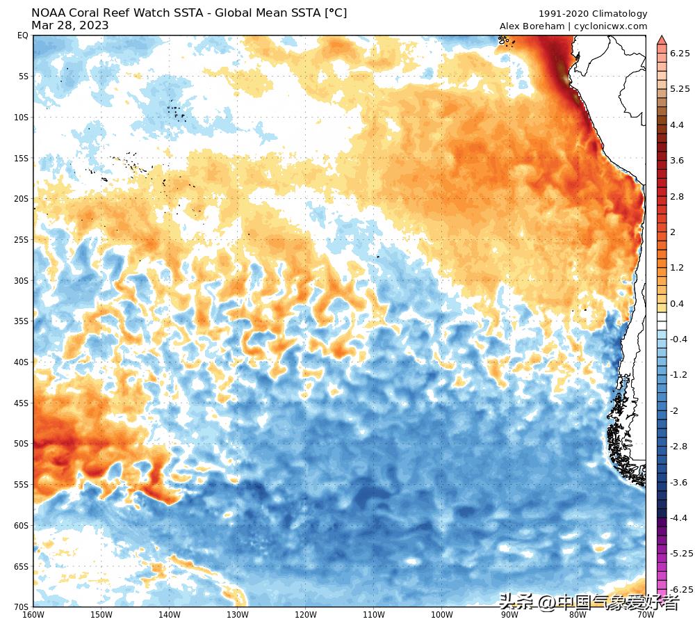 目前,不少预测中都认为,中性条件将持续整个北半球春季。不过,一些异常的情况开始在3月下旬出现——海水温度距平监测数据显示,近日在秘鲁附近出现了非常强烈的异常增暖,甚至部分地区的水温偏高达到了4度以上,属于严重偏暖。