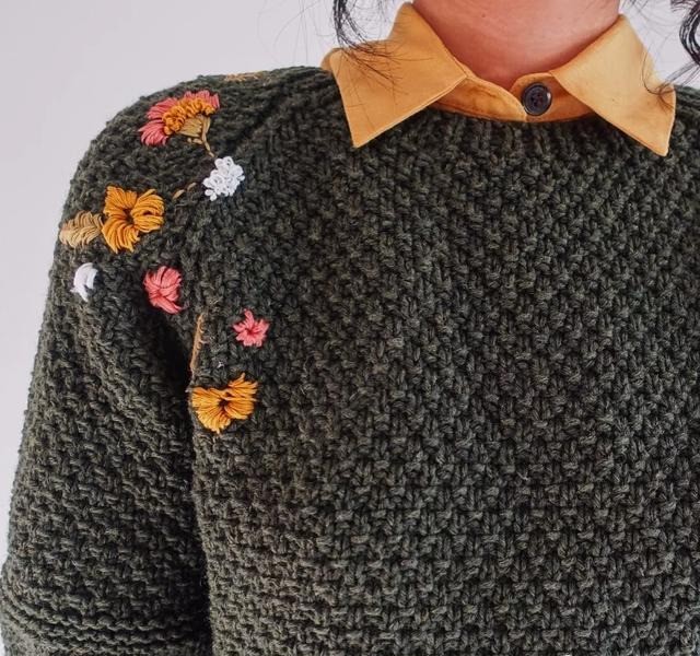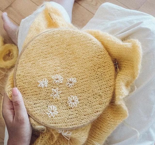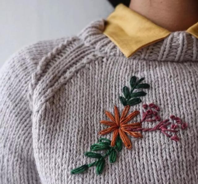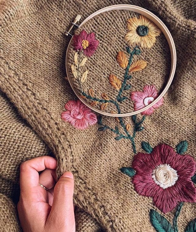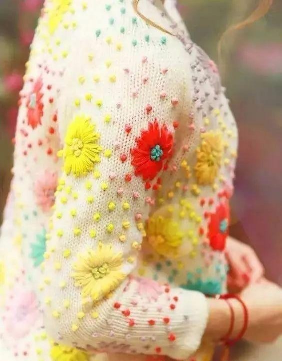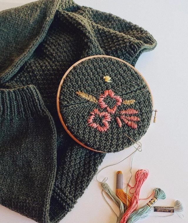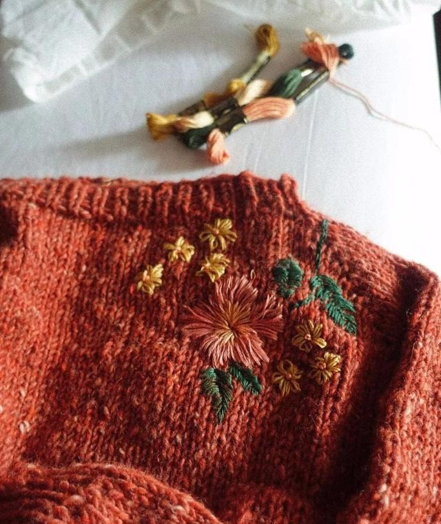 如果你家有旧毛衣,这次就可以拿出来大翻新。找一件毛衣刺绣创意走起,虽然刺绣的时候用的是毛线,但是针法跟普通绣线的绣法是一样的,如果之前就学会的针法,此时便可以利用上啦!