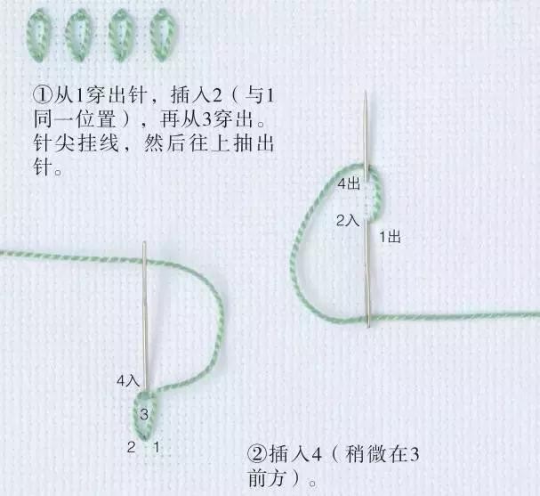 绣法:从标示1出针,从标示2入针(位置相同),在从标示3出针,在针尖上挂先,然后抽出绣针。在插入标示4入针(3稍微前点位置),其它针法大家可以去专栏学,还有100多种针法哦~