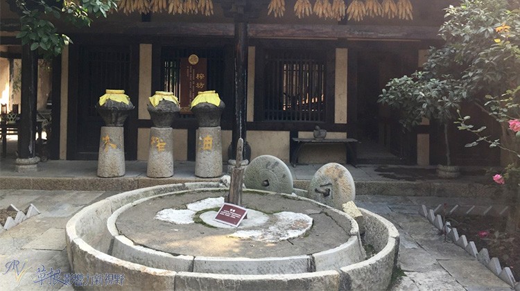 屋檐上挂有玉米,庭院上有石磨